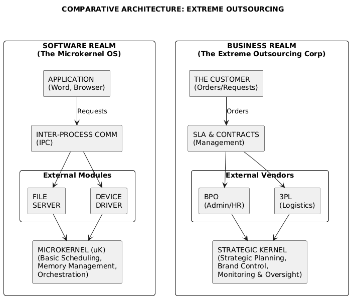 The Modules (The Components): Just as a microkernel uses a component-based structure to offload file systems and drivers, the business offloads Logistics (3PL), HR (HRO), and Manufacturing to specialized partners.